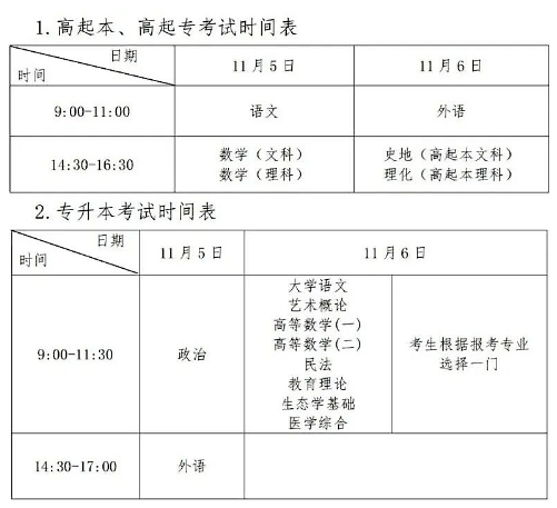 2022 年成人高校招生全国统一考试日期为 11 月 5 日和 6 日。考试依据 2020 年版《全国各类成人高等学校招生复习考试大纲》命题。  1.高起本考试科目 文科类:语文、数学、外语、史地。理科类:语文、数学、外语、理化。 2.高起专考试科目 文科类:语文、数学、外语。理科类:语文、数学、外语。 高起本、高起专的数学不再分文、理科命题,统一使用国家教育部下发的“数学(文)”试卷。报考艺术类专业的考生,数学成绩不计入总分,录取时供招生学校参考。 3.专升本考试科目 文史、中医类:政治、外语、大学语文。艺术类:政治、外语、艺术概论。 理工类:政治、外语、高数(一)。经济管理类:政治、外语、高数(二)。 法学类:政治、外语、民法。 教育学类:政治、外语、教育理论。农学类:政治、外语、生态学基础。 医学类:政治、外语、医学综合。 考试依据2020年版《全国各类成人高等学校招生复习考试大纲》命题。 1.考试在省教育考试院领导下,由各市招办按照有关考务规 定组织实施。考生在标准化考点进行考试。医学类专业考试安排 在设区市市区的标准化考点。考生须凭本人身份证和准考证按时 到指定考点参加考试(考生可在考前三天登录报名网站自行打印准考证)。2.我省成人高考实行计算机网上评卷。考生应按以下要求作 答:考生应根据要求将选择题答案用 2B 铅笔填涂在答题卡规定 位置;将非选择题答案用 0.5 毫米黑色墨水签字笔答在答题卡规 定区域,字体要工整,笔迹要清楚;不得在规定区域外答题,不 得在本题之外的其他题目栏内答题;必须按规定要求绘图、作答 及涂改。因考生自身用笔不当或不按规定作答所造成的不良后果 由考生本人承担。3.评卷工作在省招委会领导下由省教育考试院统一组织,实 行计算机网上评卷。考试成绩只通知考生本人,不公布。不对考生查卷。录取工作在省招委会领导下,由省教育考试院 组织实施。录取工作实行“省教育考试院管理监督、学校 具体负责”的录取体制,省教育考试院根据招生政策、院校计划及考生成绩对招生学校录取名单进行审核,对其录取工作进行监 督,对不符合招生政策的情况予以纠正。各招生学校要建立自我 约束机制,加强自我监督,高校纪检、监察部门要参与招生工作 并对招生工作进行全方位、全过程的监督。 省录取最低控制分数线由省招委会根据成人 高等教育对新生的基本要求,参照考生统考科目成绩和我省的招 生计划,按科类分别划定,并报教育部备案。其中,高起本、高 起专艺术类专业(除史论、编导类专业外)和体育类专业的最低控制分数线不得低于相应招生类型和考试科类最低控制分数线 的70%,艺术类高起本、高起专考生数学成绩不计入总分,由招 生学校录取时作为参考。高起专的公安类成人高校的全部专业、 医学(药学类除外)专业和中央司法警官学院的监狱管理专业、劳 教管理专业,如上线生源不足可适当降低最低控制分数线,但不得低于相应考试科类最低控制分数线的70%。高起专二次征求平行志愿阶段,各高校自行确定各科类录取标准,报省教育考试院审核备案后,按计划招生。温馨提醒:请同学们千万不要错过报名时间,否则又要等一年!
