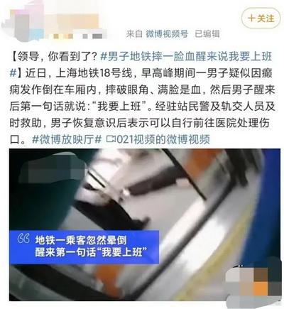 曾经,有父母替我们负重前行,才有了岁月静好的模样。 踏入生活,外面川流不息的车辆就是成年人奔波的世界。 生活从不像我们想象的那么简单,每个人都在为了生存而努力着。 前不久看到这样一则新闻。 上海一名男子在早高峰乘坐地铁时,因身体不适,摔倒在车厢内,摔破眼角,满脸是血。 在众人的帮助下,男子终于醒来了,然后他醒来后的第一句话是: