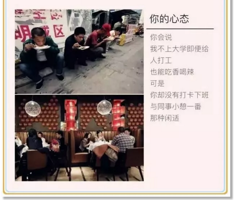 当你抱怨自己已经很辛苦的时候,请看看在西部的那些穷孩子,他们饭吃不饱,衣穿不暖,冻着脚丫,啃着窝窝头的情形;请想一想几十年如一日起早贪黑的老师们;请你对比一下那些透支着体力却依旧食不果腹的打工者,还有你们的爸妈!