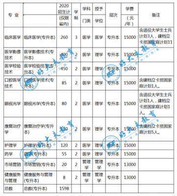 新乡医学院三全学院招生计划公布,与2019年招生计划相比,临床医学招生人数不变,康复治疗学减少140人,医学影像技术减少100人,医学检验技术减少50人,口腔医学技术减少5人,眼视光学减少10人,护理学减少140人,药学减少45人,新增健康服务与管理专业。具体招生计划如下: 2020年专升本招生计划: