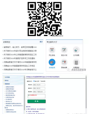 | 2020河南专升本成绩方式汇总 7月24日左右(一般是24日下午),河南省会公布普通高招最低控制线, 7月25日零时考生可以查询成绩,河南专升本查询成绩可以通过以下十种途径。 途径一:河南省招生办公室网站 http://www.heao.gov.cn/ 打开网址进入或者扫描下方二维码进入 ![]() 途径二:河南省教育厅微信网站 http://jyt.henan.gov.cn/ 打开网址进入或者扫描下方二维码进入 ![]() 途径三:河南省招生考试信息网 http://www.heao.com.cn/main/html/ 打开网址进入或者扫描下方二维码进入 ![]() 途径四:河南省普通高校招生考试服务平台 https://pzwb.heao.gov.cn/PZService/default.aspx 打开网址进入或者扫描下方二维码进入 ![]() 途径五:河南省招生办公室官方微信公众号 ![]() 途径六:河南省教育厅微信公众号 ![]() 途径七:招生考试之友微信公众号 |